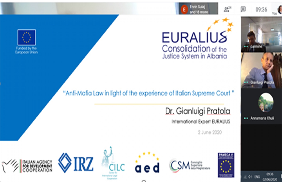 Më 2 qershor 2020, Shkolla e Magjistraturës në bashkëpunim me EURALIUS, PAMECA dhe Projektin Italian AICS / CSM organizuan një trajnim online mbi Ligjin Anti-Mafia.